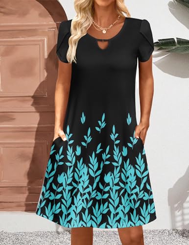 HOTOUCH Women’s Casual A-Line Dress with Pockets Summer Beach Floral Tshirt Dress Short Sleeve Mini Dress Flowy Sundresses