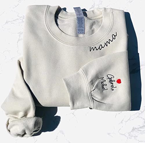 NAZENTI Custom Mama Embroidered Sweatshirt With Kids Names Sleeve-New Mom Gift Personalized, Mama Birthday