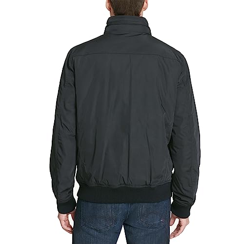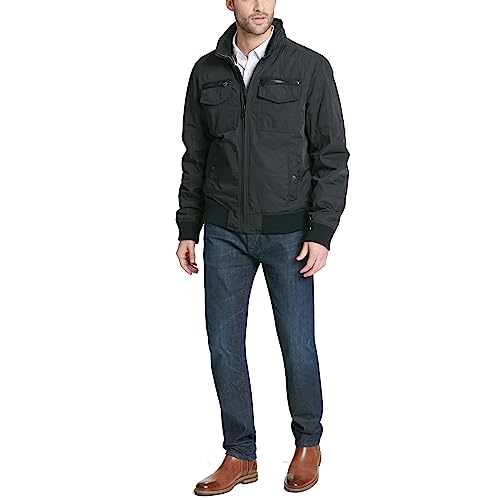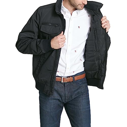 Poly twill 4 pocket efficiency mid-weight rib knit zip entrance bomber jacket with utility collar and hidden hood. Distinction quilted lining with mild poly fill insulation.